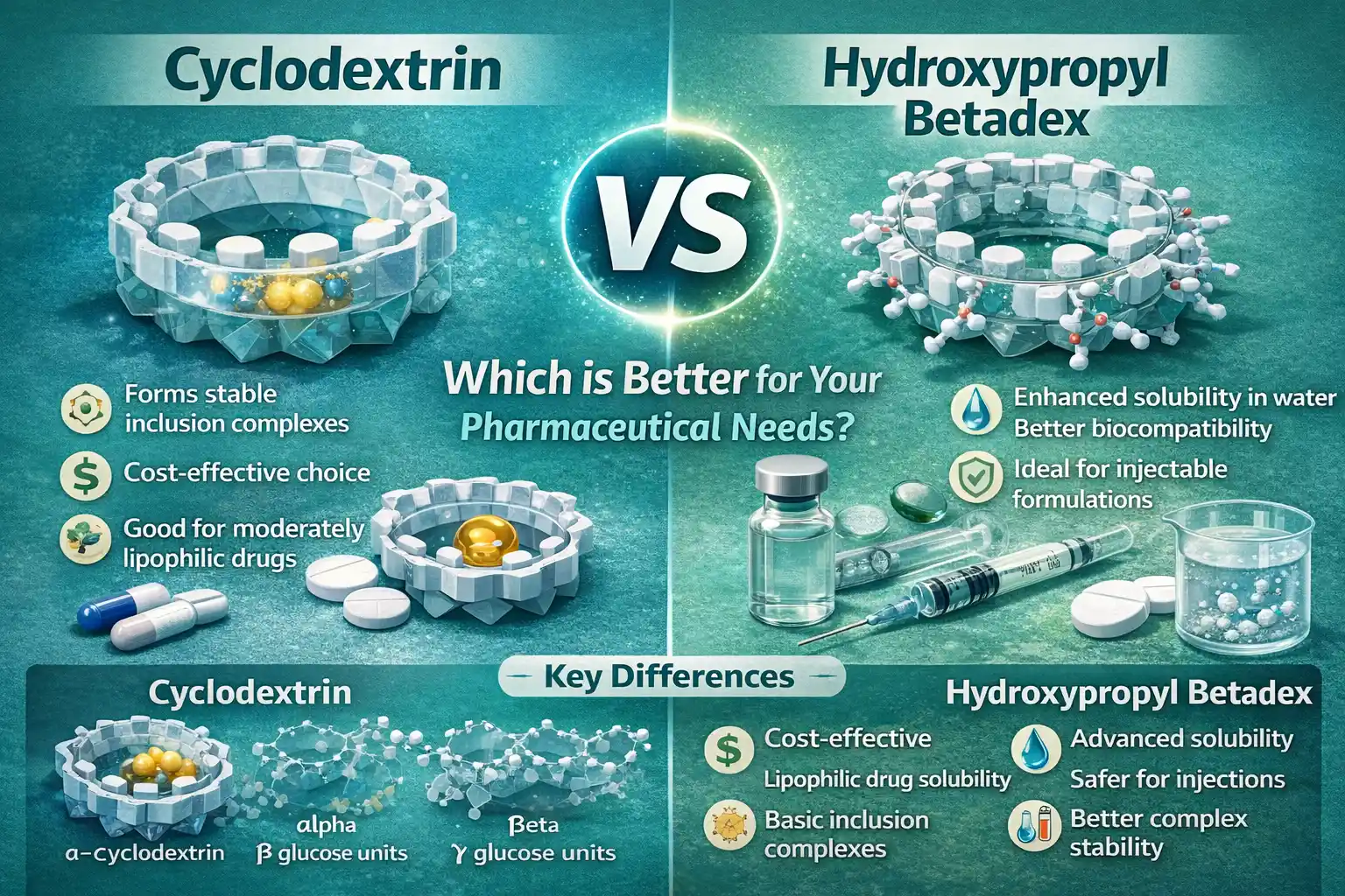 Pokiaľ ide o farmaceutické použitie, cyklodextrín ahydroxypropyl betadexoba sú dobré pre spôsoby podávania liekov svojím vlastným spôsobom. Štandardné cyklodextríny sú dobré pri uzatváraní molekúl a sú nákladovo efektívne. Na druhej strane, hydroxypropyl betadex sa lepšie rozpúšťa vo vode a je viac biokompatibilný. Výber závisí od potrieb vašej formulácie, pričom hydroxypropyl betadex poskytuje pokročilé zlepšenie rozpustnosti pre ťažké molekuly liečiva a cyklodextríny vynikajú v základných inklúznych komplexoch.