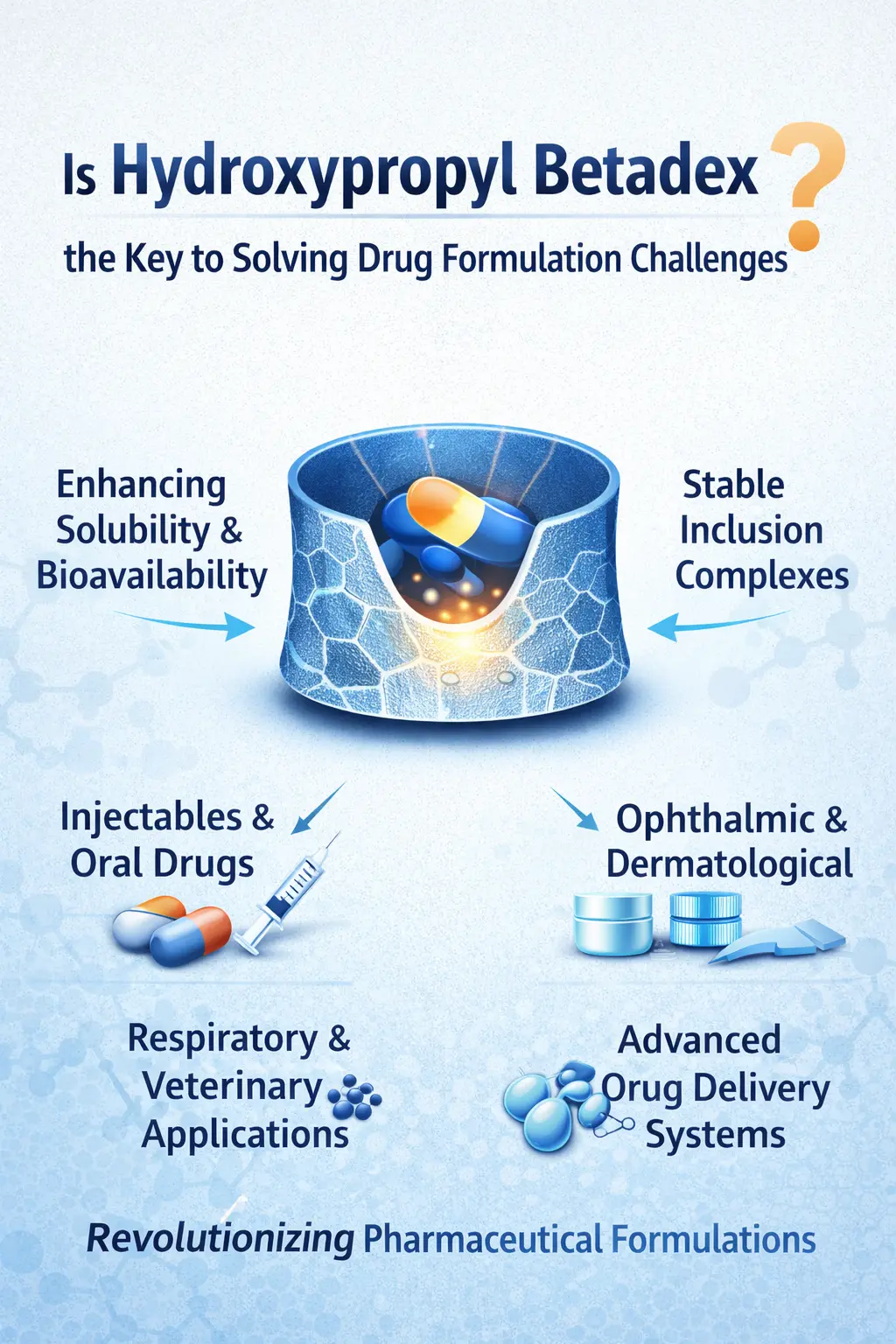Problémy s rozpustnosťou a bezpečnosťou lieku sú bežné pri injekčných liekoch.Hydroxypropyl Betadexrieši tieto problémy vytváraním stabilných inklúznych komplexov, ktoré udržujú čistotu lieku počas jeho skladovania a podávania. Chemikália umožňuje premeniť látky, ktoré boli predtým problematické, na číre, bezpečné tekuté roztoky.