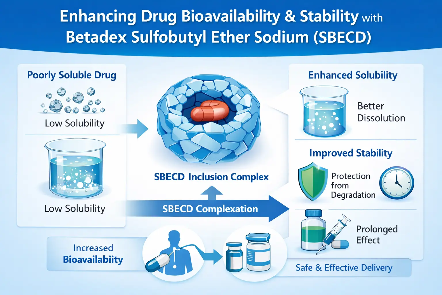 Výskumníci zistili, že komplex SBECD môže spôsobiť, že sa hydrofóbne lieky rozpúšťajú oveľa lepšie. Lepšia rozpustnosť priamo vedie k lepšej biologickej dostupnosti, najmä pri parenterálnych formách, kde sa liek musí úplne rozpustiť.