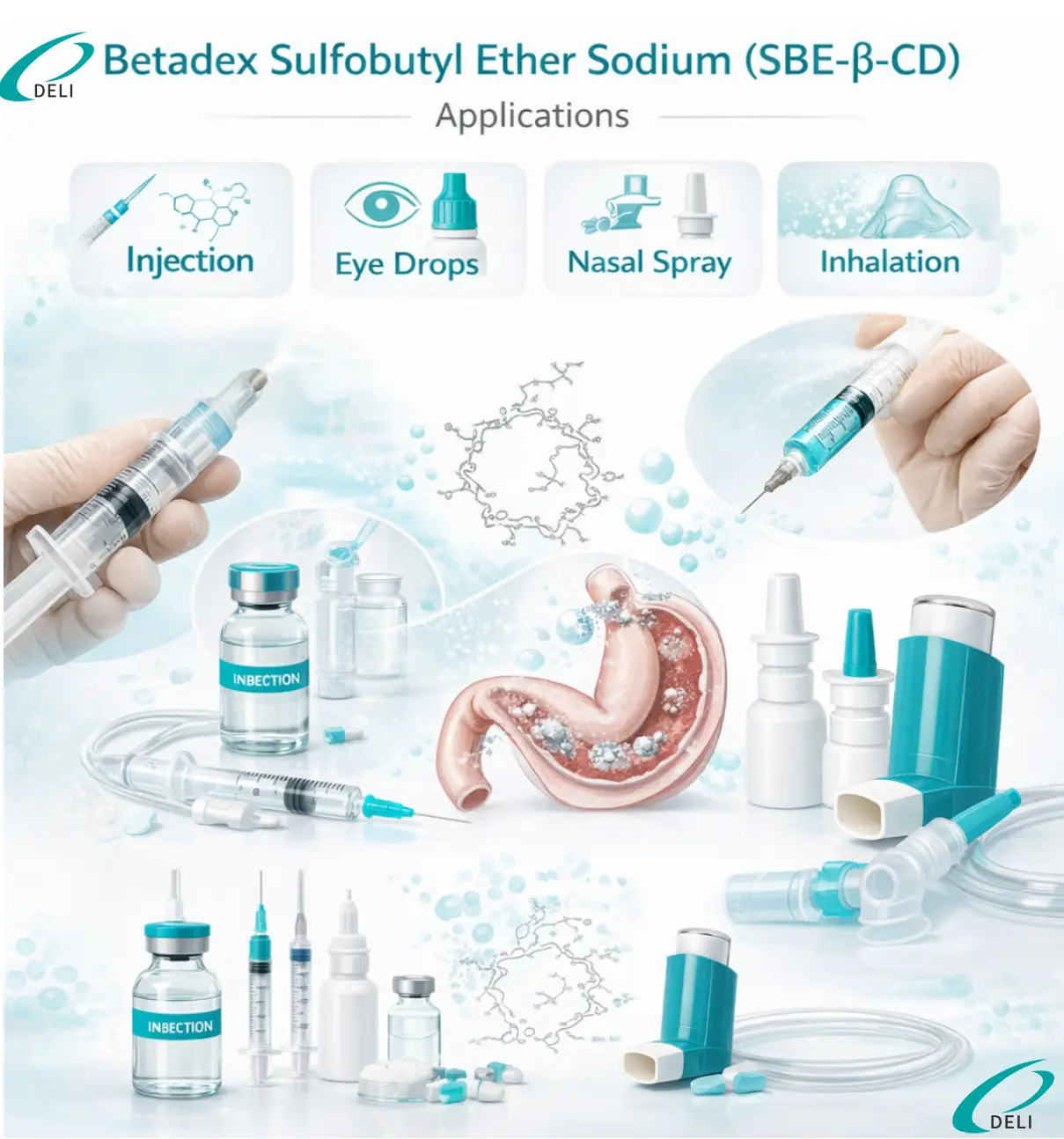 Betadex sulfobutyléter sodný na injekciu sa primárne používa v neorálnych farmaceutických dávkových formách, kde sa vyžaduje zvýšená rozpustnosť, stabilita a bezpečnosť. Široko sa používa v injekčných roztokoch na zlepšenie rozpustnosti vo vode slabo rozpustných aktívnych farmaceutických zložiek a na udržanie čírosti a stability prípravku počas skladovania a podávania.